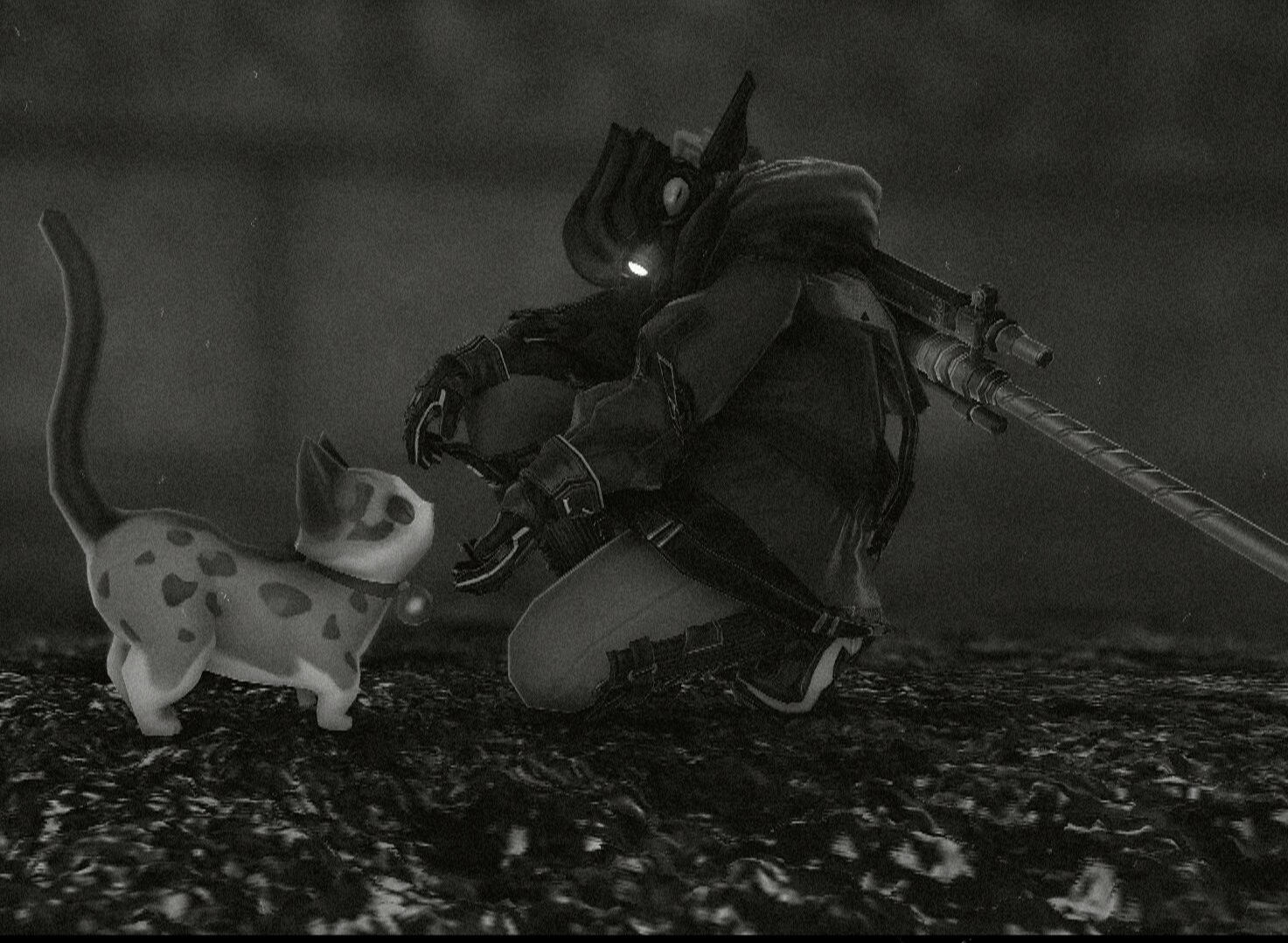 "The little one is scared, with tail between its legs, shivering from fear or the cold. Or perhaps both... It mews at me, desperate, in an attempt to plead or beg for mercy, or perhaps drive me away. Yet, it cannot bring itself to hiss or swing a claw my way. Looking down to its left front paw, I notice a bloody gash, and then I see why it didn't retaliate, why it was mewing in desperation, crying.As I bring my hands to my hood, I pull it down to reveal my visage to this lost and wounded critter. In an attempt to reassure it so, I get on my knee and extended my hand forth to it..."
