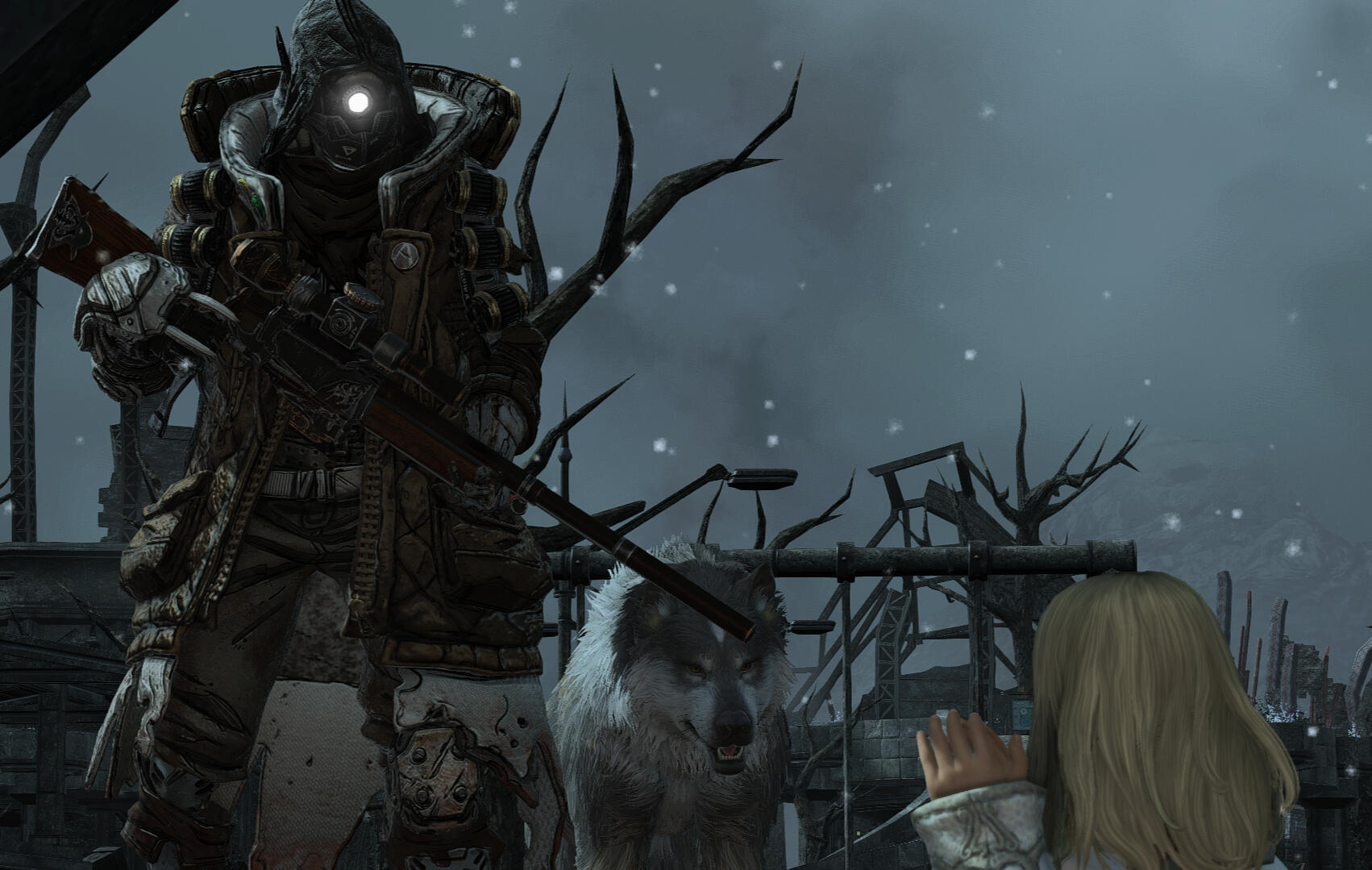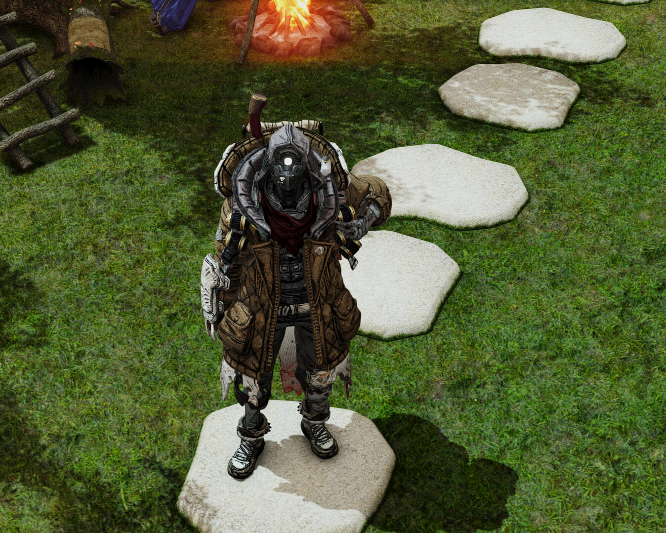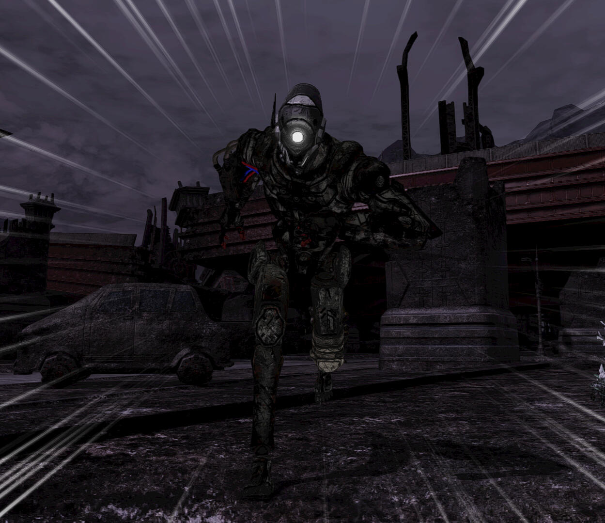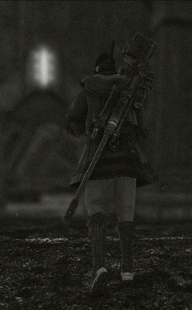 Build: Heavy Garlean Steel frameDistinguishing Features: Despite wearing a face mask, the light of his optics are very much visible and isn't hard to figure out what exactly lies underneath the cap and hood he wears and the face mask.Common Accessories: KnapsackPersonal ––– –Profession: Bounty Hunter, self-proclaimed leader of the Construct Liberation Front
