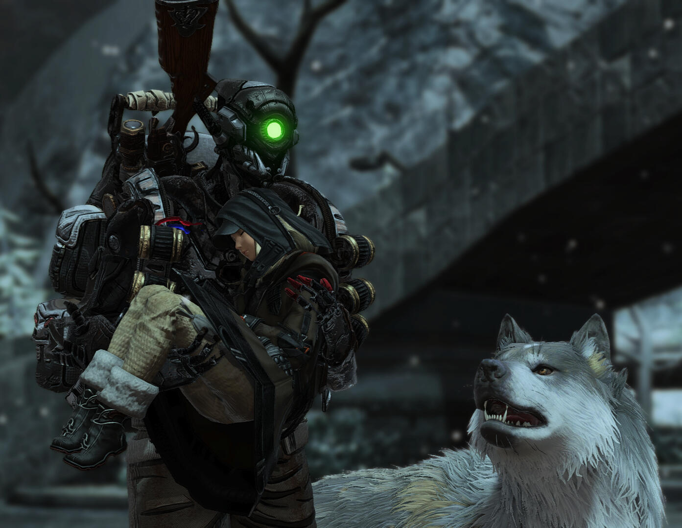 "On the outside, Luna may appear to be a cuddly, an adorable furball of joy. But, do not underestimate my ruthless friend. After hunting big game for my dearest Spot, I noticed Luna was much different in appearance to the rest of the Elban Bears in the area, like an outcast. I lowered my scope of my sniper down and approached this beautiful creature. As we traded glances, that fuzzy, silly furball of a face roared, showing her teeth and rushing at me to attack.A single swing of her paw was enough to send me across the snow a few fulms, despite my weight of 640 ponze. Causing me to retreat and try again another day, lest she tear me apart... After coming back some days later, with a new strategy and new resolve, we fought once more and proving myself triumphant over this majestic beast, Luna submitted and I offered my hand out. As she accepted my hand, I gave my girl Luna a well deserved pet and rub under her chin. The start of our friendship began then. And I knew she felt the same."