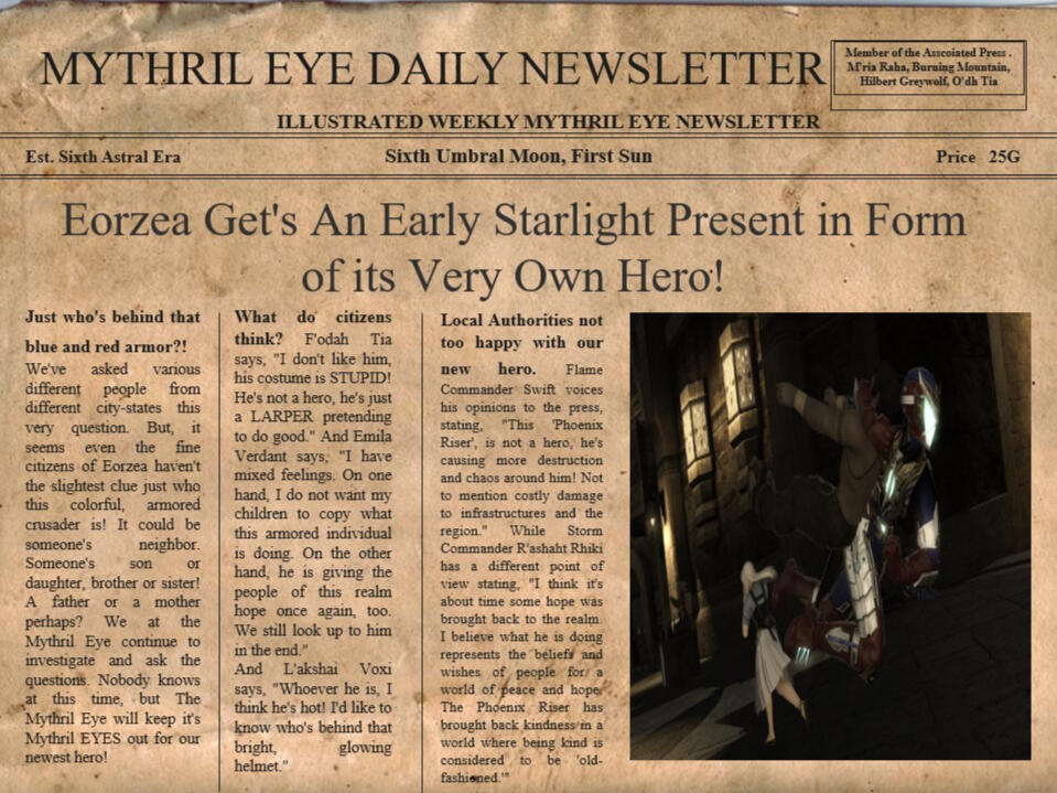 "Another one of my higher profile cases I helped. Mayhap you've read it on the Mythril Eye daily newsletter. Or mayhap not. Either way, this was simply a stranger in need of aid after being harassed by a vermin of Pearl Lane as she was making her way back home after a long day's work at the Weaver's Guild. Anyone could've helped this woman that evening, but nobody decided to step up, not even the Brass Blade guards. I simply could not have stood by and done nothing. Where those unable to fend for themselves, rest assured that the Blue Blitz shall be at your side to lift you up from above the ashes."